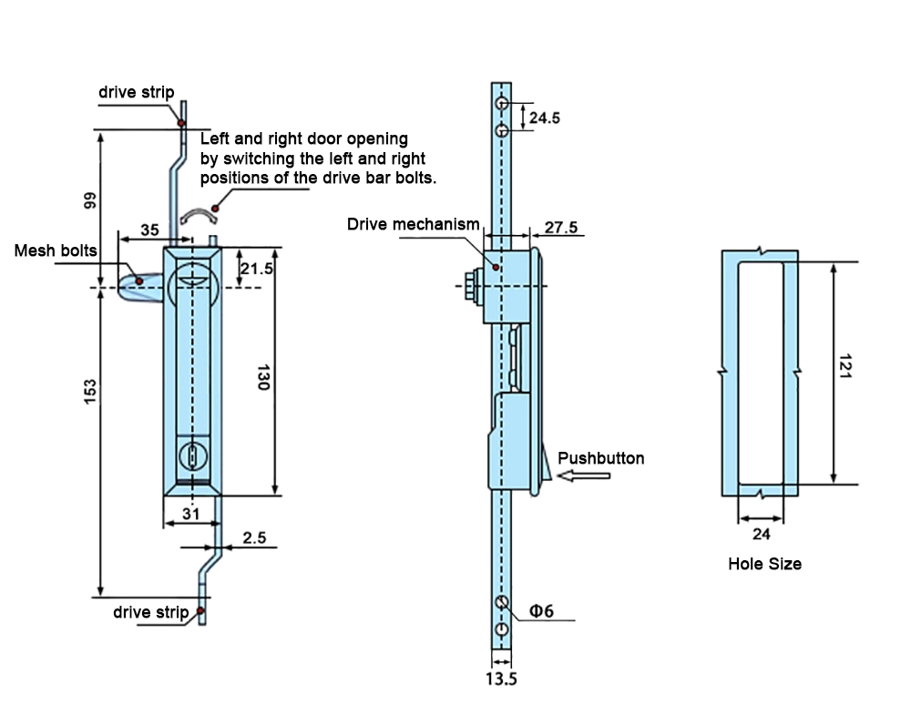 Zámok dverí z nehrdzavejúcej ocele je vyrobený z nehrdzavejúcej ocele v pôvodnej farbe z nehrdzavejúcej ocele pre odolnosť a odolnosť proti korózii. Veľkosť otvorenia je 24 mm x 121 mm, čo zabezpečuje kompatibilitu so štandardnými konfiguráciami inštalácie.